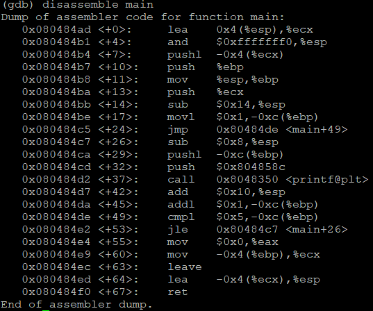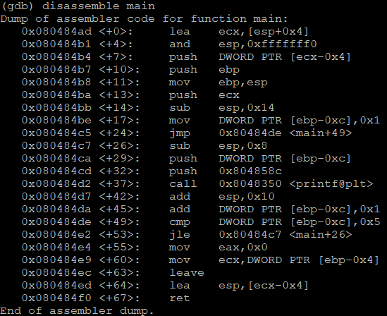 0x080484de <+49>: 83 7d f4 05 cmp DWORD PTR [ebp-0xc],0x5