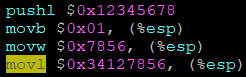 => 0x08048489 <+12>: 66 c7 04 24 56 78 movw $0x7856,(%esp)